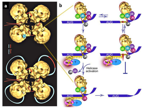 An updated speculative schematic model for the quality control function of SOS. (a) The supraspliceosome model [12,30]. Exon, red; intron, light blue. (Top) The folded pre-mRNA that is not being processed is protected within the cavities of the native spliceosome. (Bottom) When a staining protocol was used that allows visualization of nucleic acids, RNA strands and loops were seen emanating from the supraspliceosomes [12,30]. The RNA that was maintained in the cavity likely unfolded and looped-out under these staining conditions. In the looped-out scheme, an alternative exon is depicted in the upper right corner. (b) Zoom into one spliceosome. Left panel, splicing at the authentic 5′SS; right panel, splicing at the LSS. Blue stripes, exons; red line, intron; yellow narrow stripe, latent exon; red circle, in-frame stop codon; circles, U snRNPs; orange ellipse (UAC), initiator-tRNA; purple ellipse, NCL directly bound to ini-tRNA; blue ellipse, additional associated components; orange triangles, hypothesized triplet-binding proteins; red triangle, stop-codon-binding protein. Updated and adapted from refs. [40,46].