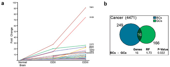 Activation of LSS in cancer: (a) Correlation between the level of activation of latent splicing and the severity of OD. The graph depicts fold changes in the level of latent splicing in 125 gene transcripts whose latent splicing expression increased from normal cells to ODII and further increased in ODIII. Names of the top-scoring gene transcripts are indicated. (b) Overlap between activated LSSs in breast cancer (BC) MCF-7 cells, and in glial tumors (GC, glioma cancer). Adapted from ref. [31].