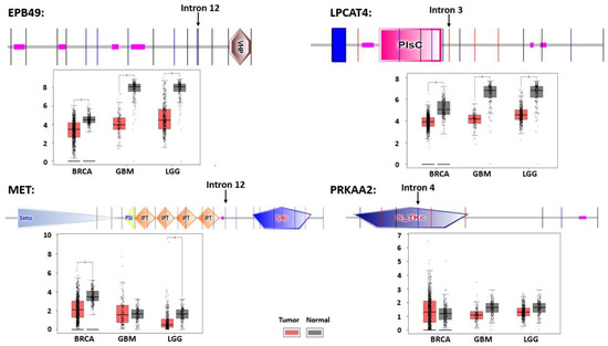 Representative gene transcripts which showed activation of latent splicing in both breast cancer cells and neuronal tumors (MCF-7 breast cancer cells; glioma and oligodendroglioma grade II and III tumors) [31]. Diagram of the protein domains, based on SMRT EMBL database, where the location of the activated LSS [31] is marked; the vertical lines refer to intron locations. EPB49, contains a low complexity region (pink box) and a VHP (Villin headpiece) catalytic domain; LPCAT4, harbors a transmembrane domain (blue box), a low complexity region (pink box), and a PlsC (Phosphate acyltransferase) domain; MET, contains a Sema (semaphorin domain), PSI domain (found in several different extracellular receptors, including plexins, which are involved in the development of neural and epithelial tissues), IPT (Ig-like, plexins, transcription factors) domain, low complexity region (pink box), and the catalytic domain TyrKc (Tyrosine kinase); PRKAA2, carries a catalytic domain S_TKc (Serine/Threonine protein kinases), and a low complexity region. Below each protein diagram, the expression of the respective gene is presented, as tested in 1085, 163, and 518 BRCA, GBM and LGG tissue samples, respectively, and in 291, 207, and 207 non-tumor tissues, based on data from GEPIA. BRCA, breast invasive carcinoma; GBM, glioblastoma multiforme; LGG, brain lower grade glioma. Red star indicates significant difference between tumors and normal tissues (p value ≤ 0.01).