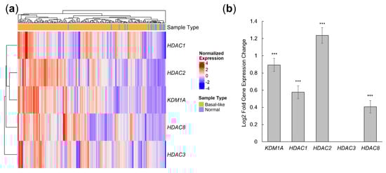 Gene expression levels were evaluated across tumors and between normal and basal-like breast tumor samples using GDC RNA-sequencing results. Since 4SC-202 is a dual epigenetic modulator for Class I HDAC and LSD1, we investigated the expression pattern for Class I HDACS, including HDAC 1, 2, 3, and 8, and the lysine demethylase KDM1A (LSD1). If these targets are overexpressed in basal-like breast tumor samples, the likelihood of 4SC-202 being an effective therapeutic is improved. These epigenetic targets of 4SC-202 are sufficient to cluster basal-like and normal samples, with basal-like samples exhibiting higher overall expression (Figure 1a). Quantification of these differences show that KDM1A, HDAC1, HDAC2, and HDAC8 have significantly higher expression levels (Figure 1b). These results indicate that targets of 4SC-202 are overexpressed in human breast cancer with a basal-like molecular signature.