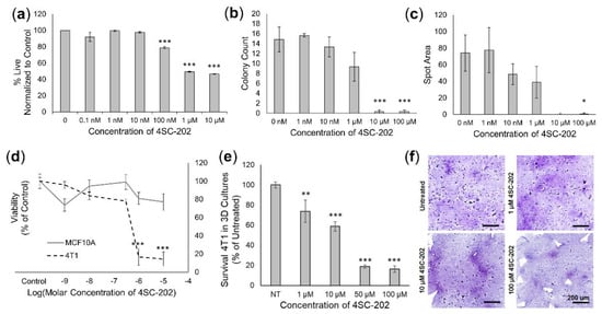 In cell culture, 4SC-202 has both cytotoxic and cytostatic effects on 4T1 cells. Cell viability experiments using the Sytox Green Fluorescence assay indicate 4SC-202 is significantly cytotoxic at concentrations ranging from 0.1 µM to 10 µM (Figure 2a) following 72 h of exposure. Colony assays similarly indicate that 4SC-202 significantly reduces the number of colonies formed after 6 days, indicating cytotoxicity at concentrations ranging from 10 to 100 µM (Figure 2b), and significantly reduces the area of colony formation (mean spot area) at 100 µM (Figure 2c), indicating that the drug may exert a cytostatic effect. In 3D spheroid models, viability assays indicate that while 4SC-202 is cytotoxic to breast 4T1 cancer cells at concentrations ranging from 1 to 10 µM, it is not cytotoxic to the non-cancer breast epithelial cell line MCF10A (Figure 2d). Similarly, 4T1 cells grown within a 3D scaffold exhibited significantly reduced dose-dependent survivability when treated with increasing concentrations of 4SC-202 after 72 h of exposure (Figure 2e), with a reduced number of hematoxylin stained 4T1 cell nuclei observed with increasing concentrations of 4SC-202 (Figure 2f).