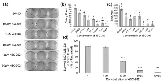 Moreover, cytotoxic and cytostatic effects are also observed when human TNBC cell line MDA-MB-231 is treated with 4SC-202. Colony assays of MDA-MB-231 indicate a significantly reduced number of colonies at concentrations of 100 nM–10 µM (Figure 3a,b) as well as decreased area of colonies from 0.1 µM to1 µM (Figure 3c). Human MDA-MB-231 cells grown within the 3D scaffold also exhibited a significant dose-dependent reduced survivability when treated with increasing concentrations of 4SC-202 for 3 days (Figure 3d). For these scaffolds, repeated measures ANOVA with a post-hoc Dunnett’s test indicate that for concentrations over 10 µM, there is a significant decrease in survival with adjusted p < 2 × 10−16.