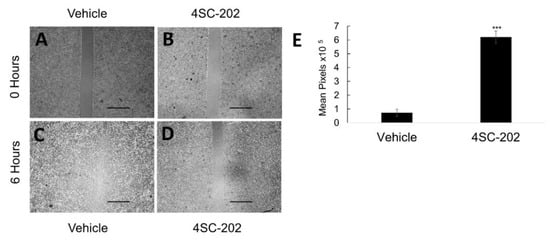 Since it is of paramount importance that potential anti-cancer therapeutics block the ability of cancer cells to migrate in order to interfere with metastasis, we examined the in vitro effect of 4SC-202 on cell migration. In vitro scratch assays (Figure 4) show a significant decrease in cell migration in the 4SC-202-treated 4T1 cell culture as compared to the vehicle DMSO control. Cells were photographed at 0 and 6 h after scratching. Measurement at 6 h was taken to differentiate between cell migration and proliferation. The measurements within the scratch region were recorded and the mean area was calculated. There was increased mean area after scratching (p = 0.0004) in the 4SC-202-treated, as compared to the vehicle, suggesting a significant decrease in cell migration as early as 6 h after the scratch. Time-dependent proliferation experiments in 4T1 indicate that after 6 h no significant changes in cell proliferation between the control and 4SC-202 treated samples were observed, according to a two-tailed t-test, (p = 0.44) (Supplementary Figure S2). In addition, based on the doubling time and growth curves of 4T1 cells, no significant change in proliferation was observed after 6 h; thus, the pronounced scratch visible at 6 h in the 4SC-202 treated samples must be due to a lack of migration.
