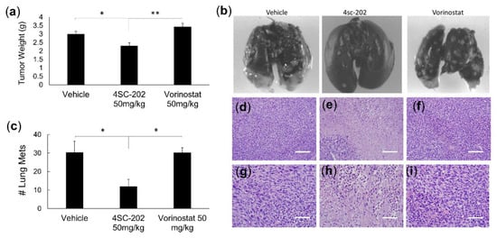 4SC-202 significantly reduces both tumor weight and lung metastasis. (a) 4SC-202 (50 mg/kg) significantly reduces tumor weight after 2 weeks of treatment compared to Vorinostat (50 mg/kg) and the vehicle control treatment (ANOVA p = 0.005). (b) Fewer metastatic nodules in the lungs are visible in 4SC-202 treated mice as compared to Vorinostat- and vehicle-treated mice. (c) Quantification of lung metastases indicates 4SC-202 significantly reduces the number of lung metastases as compared to Vorinostat and the vehicle treatment (ANOVA p = 0.02). For A and C, hypothesis testing was conducted using single factor ANOVA with a post-hoc Tukey’s test. Significance between groups is indicated p < 0.05 (*), p < 0.01 (**). (d–i) H&E staining of tumor sections from mice treated with 4SC-202 (e,h), Vorinostat (f,i) or vehicle control (d,g) indicates 4SC-202 induces marked dissolution of chromatin or karyolysis (e,h). All data were collected from mice in Experiment 2. Images are representative of 12 tumors analyzed by H&E. Magnification in (d–f) is 100× with scale bar = 25 microns., and in (g–i) is 200× with scale bar = 50 microns.
