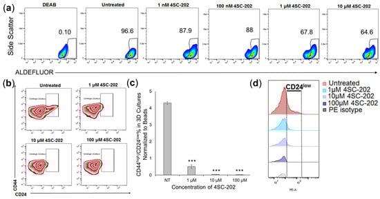 Because our past studies on other cancer types show potentially specific effects of 4SC-202 on cancer stem-like cells [4], the effect of 4SC-202 treatment on particular populations of cells was examined. The effect of 4SC-202 on 4T1 Cancer Stem Cells (CSCs) was investigated by identifying markers of CSCs. In breast cancer, a marker for cancer stem cells is ALDH fluorescence, with high ALDH levels indicative of the cancer cell population [24]. In untreated control cells, nearly 97% of the cell population was ALDH positive. Higher concentrations of 4SC-202 reduced the ALDHhigh population, as assessed by flow cytometry (Figure 6a). Approximately 5% of the total 4T1 population grown in the 3D scaffolds revealed a distinct Cancer Stem Cell (CSC) profile (CD44high/CD24low) [25,26], which significantly decreased after 4SC-202 treatment (Figure 6b,c). CD24 expression in the CD44high population is reduced with increasing concentrations of 4SC-202 (Figure 6d). These findings suggest that 4SC-202 significantly reduces the CSC population.