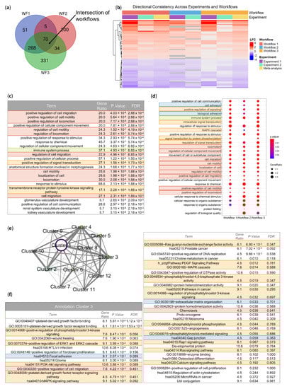 Additionally, the tool clusterProfiler was used to examine the consensus among GO biological process enrichment terms across bioinformatic meta-analysis workflow DEG lists. Instead of testing the consensus DEGs, clusterProfiler tests enrichment for the full set of DEGs for each workflow and then visualizes the consistency between workflows at the biological process level. These enrichment results indicate that there is consistency between the workflows not only at the gene level, but also at the biological process level (Figure 7d). Despite the differences in the size and content of the DEG sets across the bioinformatic workflows, the enrichment profile is quite similar in terms of both the enriched terms and their significance. In this enrichment analysis, terms related to cell movement also figure prominently (red), though terms related to the extracellular matrix (blue), immune processes (green), and MAPK signaling (orange) are also present.