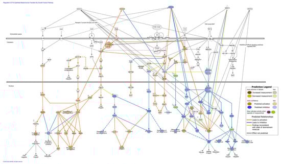 In the top canonical pathways, the regulation of the epithelial mesenchymal transition by the growth factors pathway (Supplementary File S4, Canonical Pathways tab) is also enriched with a p-value of 1.78 × 10−5. An IPA-based prediction of the molecular activity of this pathway dependent on the directionality of the log fold change of the 4SC-202-induced DEGs suggests that the activity of this signaling pathway may be altered in 4SC-202-treated mice relative to the control (Figure 8). In both the EMT-related pathway (Figure 8) and the cancer- and cell movement-related networks (Supplementary Figures S9–S11), activity prediction indicates a mixture of activation and deactivation of subnetworks based on the 4SC-202-induced gene expression changes. Interestingly, the predicted deactivation of the EMT-related pathway appears to be principally supported by the underexpression of FOXC2 (Supplementary Figures S5 and S8). This underexpression is consistent between Experiments 1 and 2 (Supplementary Figure S5) showing reproducibility. Additionally, when HDAC 1, 2, 3, and 8 and KDM1A were added to the EMT-related signaling pathway, a majority of the known connections between the targets of 4SC-202 and the signaling network elements were localized in areas of the signaling network that had decreased predicted activity.