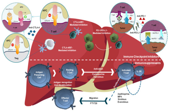 Since the mechanism of action of immunosuppressant treatment highlighted in Figure 1, in theory, is against the intended effects of ICPIs in non-transplanted patients, it is an area that needs to be explored and investigated for liver transplants candidates and recipients who is receiving ICPI treatment. Immunosuppressants may have unwanted effects on these patients by reducing the efficacy of ICPIs that require a normal T-cell response for proper function Figure 1.