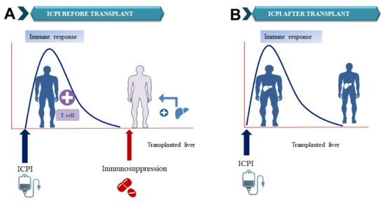 There are two scenarios where ICPI can be used in liver transplant candidates or recipients Figure 2. In the first scenario, ICPI will be used in the pre-transplant setting in liver transplant recipients as bridging or neoadjuvant therapy Figure 2A. In this setting, ICPI will unleash the immune system and active T-cell to attack and kill cancer cells. This state of the “hyperactive” immune system occurs in the absence of the allograft. Once ICPI is held, the immune system will “cool off” and return gradually to the normal body immune state at which a new liver transplant can be achieved safely. In addition, the use of significant immunosuppressants peri-transplant will further dampen the immune system to protect the graft from the recipient’s own immune system which will further neutralize the effect of ICPI during this crucial time for the new allograft. An appropriate time interval between the last dose of immunotherapy and the liver transplant will further support the safety of ICPI before transplant. The ideal time is yet to be determined; however, 4–12 weeks have been reported.