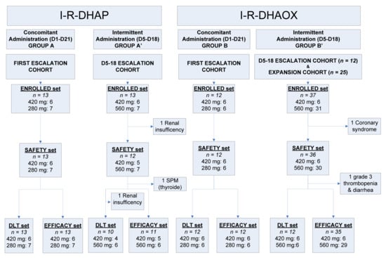 - Tixier, F.; Ranchon, F.; Iltis, A.; Vantard, N.; Schwiertz, V.; Bachy, E.; Bouafia-Sauvy, F.; Sarkozy, C.; Tournamille, J.F.; Gyan, E.; et al. Comparative Toxicities of 3 Platinum-Containing Chemotherapy Regimens in Re-lapsed/Refractory Lymphoma Patients. Hematol. Oncol. 2017, 35, 584–590. [Google Scholar] [CrossRef]