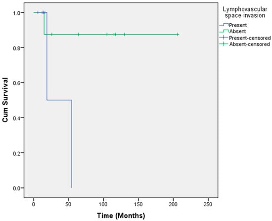 The mean overall survival for this group of women was 152.2 months (6–206 months). The mean overall survival for women with positive lymph nodes was 44.3 months (6–117 months), while node negative women had a mean overall survival of 88.1 months (15–206 months). There was only one woman in the node positive group with extracapsular spread. On multivariate analysis, survival was not significantly associated with age, lymph node status or tumour diameter. However, prognosis was significantly worse if lymphovascular space invasion was present in the primary tumour. The mean survival among women with lymphovascular space invasion was 36.5 months compared to 182.1 months when lymphovascular space invasion was absent (p = 0.05) (Figure 1).