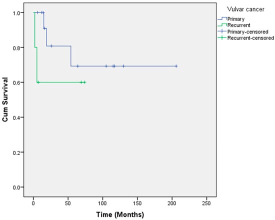Kaplan–Meier estimates of survival for pelvic exenteration for primary and recurrent locally advanced vulvar cancer.