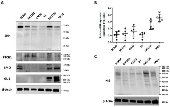 Investigation of hedgehog signaling pathway in thyroid cancer-derived cell lines. Three papillary thyroid cancer cell lines (BCPAP, K1, TPC-1) and three anaplastic thyroid cancer cell lines (BHT101, CAL62, SW1736) were subjected to western blot analysis. (A) Evaluation of the hedgehog signaling pathway. (B) Quantitative analysis of GLI1 expression in several thyroid cancer cell lines. ß-actin was used as an internal control. Mean ± standard deviation (SD) values from three independent experiments are presented. (C) Confirmation of NIS protein expression level in thyroid cancer-derived cell lines. ß-actin was used as an internal control. Raw data is presented in Figures S2–S4.
