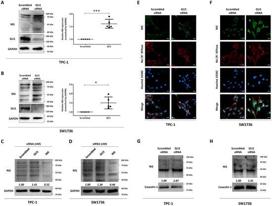 Changes in endogenous NIS expression and its localization in GLI1-inhibited thyroid cancer cells. Both TPC-1 and SW1736 cells were treated with scrambled siRNA, GLI1 siRNA or NIS siRNA for 48 h. (A) Changes in NIS and GLI1 expression induced by GLI1 siRNA treatment in TPC-1 cells. GAPDH was used as an internal control. Mean ± SD values from five independent experiments are presented. *** p < 0.001 (Student’s t-test). (B) Evaluation of NIS expression via GLI1 knockdown in SW1736 cells. Mean ± SD values from five independent experiments are presented. * p < 0.05 (Student’s t-test). Western blot analysis for NIS protein with scrambled siRNA, GLI1 siRNA or NIS siRNA treatment to TPC-1 cells (C) and SW1736 cells (D). Immunofluorescence images showing localization of endogenous NIS expression in TPC-1 cells (E) and SW1736 cells (F). Scale bar: 20 µm. Expression of endogenous NIS protein in plasma membrane fraction by GLI1 knockdown in TPC-1 cells (G) and SW1736 cells (H). Caveolin-1 were used as loading controls for plasma membrane proteins. Raw data is presented in Figures S5–S10.