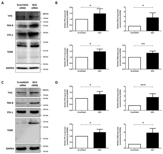 Evaluation of the expression of thyroid-specific proteins and transcription factors in thyroid cancer-derived cells with GLI1 knockdown. Both TPC-1 and SW1736 cells were treated with scrambled siRNA or GLI1 siRNA for 48 h and changes in the expression of thyroid-specific proteins were evaluated. (A) Western blot analysis showing expression of thyroid-specific proteins (thyroperoxidase (TPO) and TSH receptor (TSHR)) and transcription factors (PAX-8 and TTF-1) in TPC-1 cells. (B) Quantitative analysis of western blots. GAPDH was used as an internal control. Mean ± SD values from at least three independent experiments are reported. * p < 0.05, ** p < 0.01 (Student’s t-test). (C) Changes of thyroid-specific proteins and transcription factors expression in SW1736 cells with GLI1 knockdown. (D) Quantitative analysis of thyroid-specific proteins and transcription factors expression in SW1736 cells. Mean ± SD values from at least three independent experiments are presented. * p < 0.05, *** p < 0.001 (Student’s t-test). Raw data is presented in Figures S11–S14.