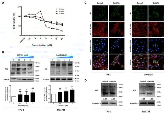 Efficacy of GANT61 in restoring endogenous NIS expression in thyroid cancer cells. Both TPC-1 and SW1736 cells were exposed to GANT61. (A) Results of cell viability assay showing time- and dose-dependent effects of GANT61 in TPC-1 cells. Mean ± SD values from three optical density (OD) is reported. (B) Endogenous NIS expression in whole cell lysate after treatment with GANT61. GAPDH was used as a loading control. The results are expressed as mean ± SD values of the experiment performed in quintuplicates. * p < 0.05, ** p < 0.01, NS: Not Significant (by Student’s t-test). (C) Immunofluorescence images for monitoring changes of expression and localization with endogenous NIS in thyroid cancer-derived cells treated with GANT61. (D) Change of endogenous NIS expression in plasma membrane proteins. Caveolin-1 were used as loading controls for plasma membrane proteins. Raw data is presented in Figures S15 and S16.