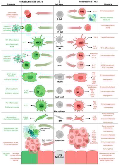 Cell type-specific effects of hyperactive and attenuated STAT3 signaling, with anti-tumor effects in green and pro-tumor effects in red. Figure created in BioRender.