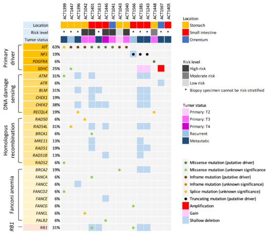 Mutational landscape of GISTs in RB1 and homologous recombination repair-related genes: Types of aberrations are annotated and catalogued into DNA damage-sensing, homologous recombination, and Fanconi anemia pathways, and RB1 as indicated by the color codes at the bottom. Note that DNA damage-sensing genes, e.g., CHEK2, are preferentially targeted by heterozygous deletion (HetDel) in contrast to another two groups mainly affected by isolated SNVs, such as missense or splicing mutations. Note that 2 of 16 samples exhibited co-occurring HetDels of RB1 and BRCA2 with close proximity to each other on 13q. Columns represent individual tumors and rows represent individual aberrated genes. DNA damage repair genes are collated based on the prevalence of CNVs and SNVs/indels, following the primary GIST-driving mutations (KIT, PDGFRA, NF1, SDHC) and the baseline clinicopathologic characteristics, including tumor locations, NCCN risk levels, and status of tumor specimens. Asterisks indicate biopsy samples not amenable to precise risk-stratification by histology.