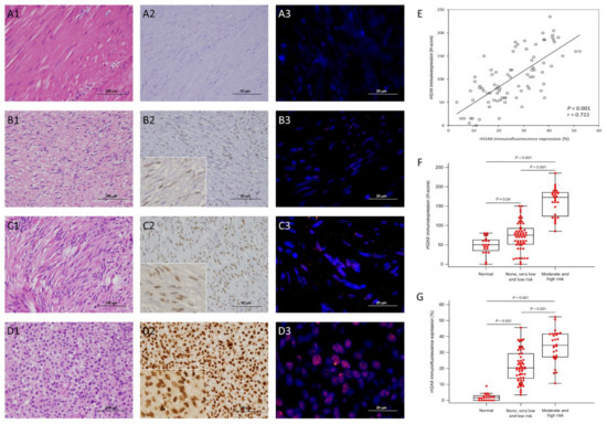 Immunohistochemical and immunofluorescence expressions of rH2AX in gastrointestinal stromal tumors across various risk categories. Representative adjacent normal tissue (A1) and gastrointestinal stromal tumors (GISTs) at low-risk (B1), moderate-risk (C1), and high-risk (D1) levels exhibited no (A2) to weak (B2), moderate (C2), and diffuse strong (D2) immunohistochemical (IHC) nuclear rH2AX reactivity (×200), respectively, in a granular pattern, as highlighted in the insets (B2–D2, ×400). In the immunofluorescence analysis of rH2AX, the percentages of positively labeled nuclei, presenting as fine to coarse red speckles, increased gradually from normal (A3) to low-risk (B3), moderate-risk (C3) and high-risk (D3) GISTs. (E) The scatter plot reliably demonstrates a strong association between the H-score of rH2AX immunoexpression on the Y-axis and immunofluorescence expression on the X-axis (p < 0.001, r = 0.722). Compared to the normal tissues, the expression levels of rH2AX determined by IHC ((F), p < 0.001) and IF ((G), p < 0.001) assays were significantly elevated in the 84 GISTs; the major differences occurred in normal tissues versus none/very low-/low-risk cases (IHC, p = 0.04; IF, p < 0.001), and in the latter merged group versus the combined moderate/high-risk GISTs (p < 0.001 for both IHC and IF).