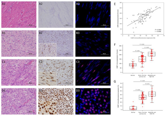 Immunohistochemical and immunofluorescence expression of 53BP1 in GISTs across various risk categories. Compared with the adjacent normal tissue (A1) without very limited and weak nuclear reactivity (A2), representative GISTs showed gradually increasing cellularity and greater epithelioid cytomorphology from the low-risk (B1) to the moderate-risk (C1) and high-risk (D1) cases, via histology (×200), and also exhibited focal (B2), moderate (C2) and diffuse strong (D2) nuclear 53BP1 expression, via immunohistochemistry (IHC), in a granular pattern (insets of B2–D2, ×400). Compared with the scarce and trivial dot-like signals indicative of very low endogenous expressions in adjacent normal tissue (A3), the immunofluorescence (IF) analysis of 53BP1, similar to IHC, revealed gradually increasing percentages of positively labeled nuclei from the low-risk (B3) to the moderate-risk (C3) and high-risk (D3) GISTs, respectively. (E) The scatter plot reliably exhibits a strong correlation between the H-score of 53BP1 immunoexpression on the Y-axis and immunofluorescence expression on the X-axis (p < 0.001, r = 0.696). The bar charts show similarly and overtly elevated expressions of nuclear 53BP1 in the H-score via IHC ((F), p < 0.001), and in the percentages of positive cells using IF ((G), p < 0.001), resulting from the increased levels of the 84 GISTs, wherein the differences were all strongly significant between normal tissue and none/very low-/low-risk cases, and between the latter merged group and the joint group of moderate/high-risk GISTs (p < 0.001 in all subgroup comparisons via IHC and IF).