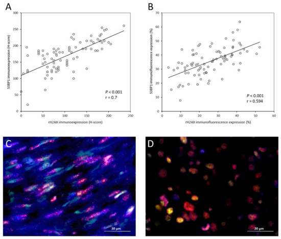 Further, we assessed how γ-H2AX and 53BP1 were associated via their expression status, as analyzed by both IHC and IF, and we found strong positive linear associations between the H-scores of γ-H2AX and 53BP1 by IHC (Figure 4A, p < 0.001, r = 0.700), and between expression percentages of tumor cells exhibiting foci of γ-H2AX and 53BP1 by IF (Figure 4B, p < 0.001, r = 0.594). Next, the relationship between γ-H2AX and 53BP1 in the subcellular localization was analyzed by a dual-color IF assay in eight representative cases with higher expression percentages of tumor cells presenting foci of both γ-H2AX and 53BP1, in which the merged signals of γ-H2AX and 53BP1 labeling clearly demonstrated their co-localization in the form of yellow nuclear speckles (Figure 4C,D).