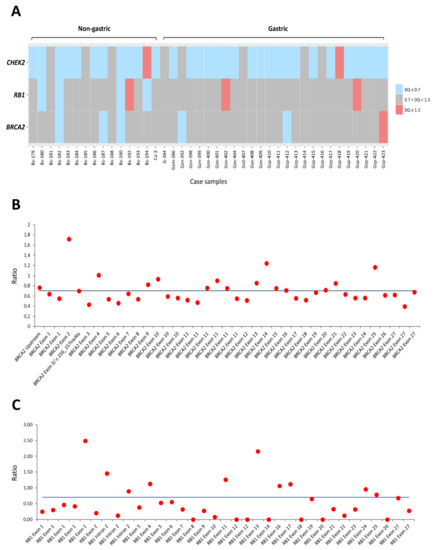 The copy number alterations of RB1, BRCA2, and CHEK2 genes determined by MLPA assay. (A) The schematic illustration of MPLA assays shows frequent heterozygous deletions (HetDels) of CHEK2 in approximately three quarters of the 41 samples tested, without significant differences between gastric and non-gastric cases. HetDels of RB1 and BRCA2 were much rarer than CHEK2-HetDel, while RB1-HetDel, rather than BRCA2-HetDel, has showed clear predominance in non-gastric GISTs. Losses of RB1 and BRCA2 trended toward co-deletion, but were rare events in two non-gastric cases. For each tumor tested, a gene was construed as harboring HetDel if it had a dosage quotient (DQ) of ≤0.7, and these are coded in pale blue, while normal ones are coded in grey with a DQ between >0.7 and <1.3, and duplicated ones are coded in red with a DQ ≥ 1.3. (B,C) In a representative case subjected to MPLA assays, across multiple exons, there were complex losses of BRCA2 (B) and RB1 (C) genes, whose DQ ratios (Y-axis) dropped below the blue lines.