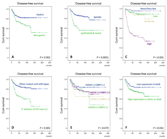 Specifically, the DFS rates at 5, 10, and 15 years were all 86% in the double-low expressers, and were 77.8%, 76.2%, and 74.6% in the joint group comprising other combinations of γ-H2AX and 53BP1. Collectively, these findings indicate that the increased expression of either γ-H2AX or 53BP1, or both, might signify a perturbed genomic integrity associated with DNA damage, and represent a harbinger of progression. In multivariate analysis, a high NCCN risk level (p < 0.001), 5′ deletion of the KIT exon 11 (p = 0.005), and the presence of epithelioid histology (p = 0.033) remained clear prognostic indicators of shorter DFS, while other univariately significant factors lost their independence, including the combination of γ-H2AX and 53BP1.
