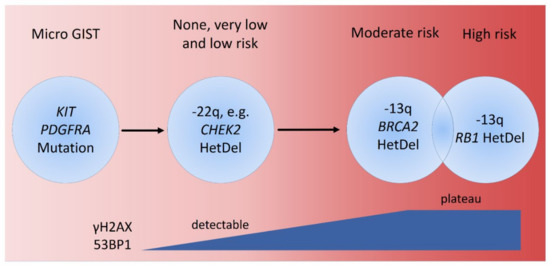 In conclusion, the SNVs of genes in the DDR pathways are often insufficiently recurrent and usually indefinitely pathogenetic, as profiled by NGS. In contrast, HetDels represent the most common form of aberrations in DDR genes, and the highly frequent CHEK2-HetDel may play an early inceptive role in GISTs (Figure 7). However, RB1 and BRCA2 can be separately deleted or concomitantly lost in a heterozygous manner in a minor subset of high-risk cases, often accompanied by deregulated 53BP1 and/or γ-H2AX. γ-H2AX and 53BP1 foci begin accumulating in the no/very low-/low-risk cases as early events in the evolution of GIST, and reach similarly high expression levels in moderate-risk and high-risk cases. As a potential surrogate of the more laborious IF examination, the immunohistochemical evaluation of γ-H2AX and 53BP1 is applicable to GIST samples in which higher risk levels, amongst other adverse factors, are robustly associated with increased expressions of both markers. In addition, the utility of a combined assessment of both 53BP1 and γ-H2AX by IHC is justified. These features are in accordance with the role of 53BP1, in cooperation with γ-H2AX, in signifying DNA repair and GIN, while functional validation is warranted to corroborate the biological, and perhaps therapeutic, relevance of recurrently aberrated DDR genes in GISTs.