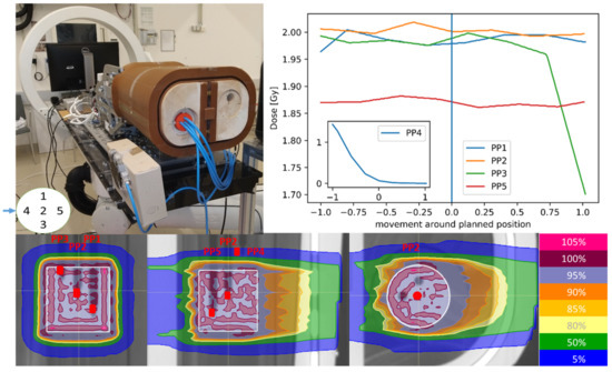 The spatial resolution and the number of PP chambers potentially reduced the overall sensitivity of the analysis. The number of PP chambers within the small tumour volume could not be increased as shadowing of the chambers needed to be carefully avoided. PP chamber measurements in the static phantom were reproducible and acquired within 0.5% for all measurements in a period of one year reflecting the highly accurate and reproducible X-ray-guided setup and proving the sufficient accuracy with respect to dose heterogeneity in the static scenario. The partial irradiation of the PP chambers, especially in the penumbra region, might have influenced the dosimetric accuracy of the measurements during motion. With a sensitive volume of 0.03 cm3 and a motion speed of 0.8 cm/s, PP3 in the penumbra region of the target (Figure 1) was partially moved out of the irradiation field in 12.5% of the delivery time. This could have potentially led to a lateral electronic disequilibrium affecting the conversion of signal into dose-to-water in the detector [26]. The directional response of the PP chambers, which was smaller than 0.5% for rotation around the chamber axis, was carefully prevented by fixing the chambers with a screw in the insert.