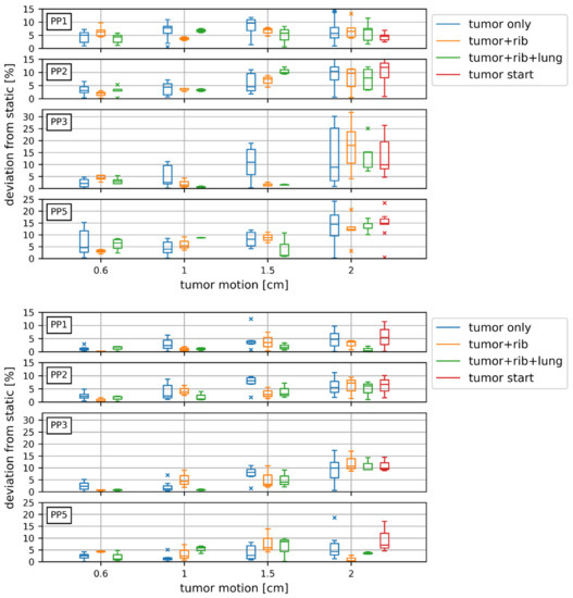 A comparison of the different tumour motion amplitudes showed that for PP2, PP3, PP4, and PP5 a tumour motion of 2 cm had a significantly (p < 0.05) higher impact on the dose values than a tumour motion of 0.6 cm.