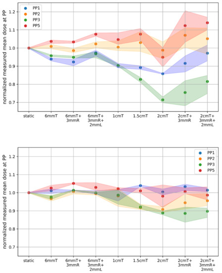 Absolute dose values and reported dose deviations for all motion scenarios were compared to the respective static measurements. An unequal variance t-test, Welch’s t-test, was performed (significance level p < 0.05) to compare the different motion scenarios to the static scenario and to each other, as well as to compare proton and carbon-ion measurements.