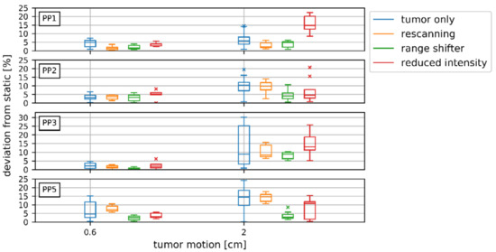 The use of different beam characteristics employing a bigger spot size changed the initial dose distribution, which, essentially, resulted in an increased dose outside the tumour for PP4 from 0.04 ± 0.02 Gy to 0.16 ± 0.08 Gy for the static scenario (p < 0.05). For the range shifter plan the 0.6 cm tumour movement resulted in a deviation of the dose up to 3% compared to the static scenario. For a motion amplitude of 2 cm the deviation was 3.9% ± 1.9% for PP1, 4.5% ± 3.1% for PP2, 8.2% ± 2.0% for PP3, and 3.7% ± 2.2% for PP5 compared to the static range shifter plan, which was a significant decrease in the dose distortion (p < 0.05) compared to the deg20 plan with the same motion. In general, increasing the spot size reduced the dose distortion and the results were more comparable to the static scenario.