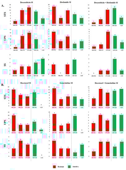 Histograms of SI frequencies of STS primary cultures for chemotherapeutic drugs and their combinations. (A). Number of SS, UPS, and STS primary cultures in the groups formed by SI to Dox, Ifo, and DOX + IFO; (B). Number of SS, UPS, and STS primary cultures in the groups formed by SI to Doc, Gem, and Doc + Gem. Red color indicates resistance; green color indicates sensitivity to the drugs.