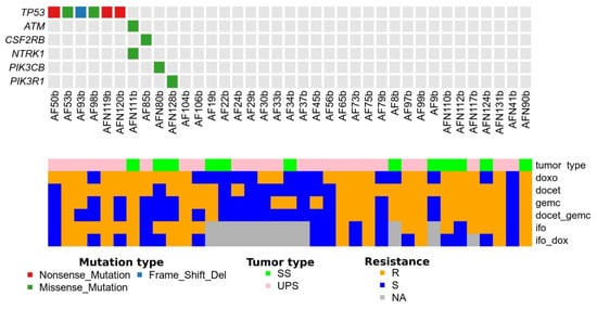 Data on resistance/sensitivity of STS specimens from a studied cohort of patients with/without structural alterations of genes associated with apoptosis induction, according to KEGG_APOPTOSIS. SS—synovial sarcoma, UPS—undifferentiated pleomorphic sarcoma, R—resistant STS, S—sensitive STS, NA—not available.
