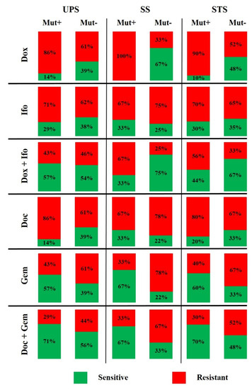Histograms of partial ratio (%) of sensitivity and resistance to the drug primary STS cultures depending on the somatic mutational status of apoptosis activation pathway genes.