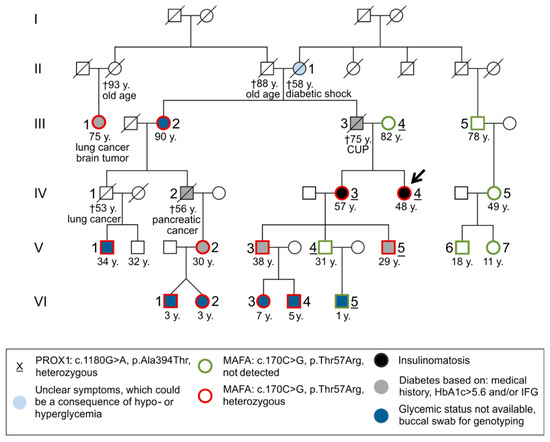 Figure 1. Pedigree, presenting genotype, phenotype and age of the family members. Four generations of the family underwent further molecular genetic (MAFA Thr57Arg and PROX1 Ala394Thr; genotyped individuals marked by the bold border of the symbols) and laboratory testing as well as an evaluation of the medical history. In individuals with the symbol filled in dark blue, only a buccal swab was available for laboratory analysis (III2, V1, and VI1–5), suitable for genotyping but not for metabolic analyses, e.g., the determination of HbA1c. MAFA Thr57Arg was detected (symbols with red bold border) in 12 family members (III1–2, IV3–4, V1–3, V5, and VI1–4), 2 with insulinomatosis (IV3–4, arrow points on index case), 4 with an overt diabetes (III1 (based on patient medical history), V2–3 and V5 (HbA1c > 5.6 or impaired fasting glucose (IFG)), and 6 members (4 children below 10 years (VI1–4) and 2 adults (III2 and V1)) whose glycemic status was unclear, because blood samples were not available. Furthermore, diabetes mellitus was known in 2 deceased individuals (III3 and IV2). In 7 family members who did not carry Thr57Arg (symbols with green bold border), neither diabetes nor insulinomatosis has been detected (III4–5, IV5, and V4 + 6–7) or they had an unclear glycemic status (VI5). Subject numbers of the six PROX1 Ala394Thr carriers are underlined (III4, IV3–4, V4–5, and VI5). The MAFA mutation is inherited through the left wing of the pedigree (starting with the left couple in generation I). The PROX1 variant, on the other hand, was introduced into the pedigree by person III4 and is, thus, inherited only throughout one branch. CUP = cancer of unknown primary; y. = age in years; † = deceased.