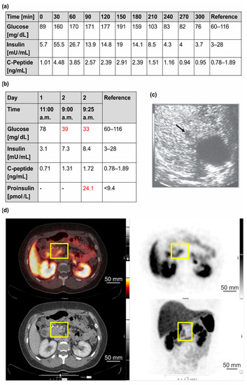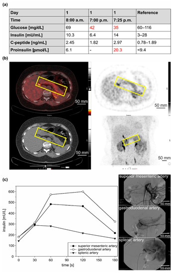 Since the age of 45, the patient had suffered from recurrent episodes of fatigue, confusion, blurred vision, and tremors, which improved with food intake. The consequence was continual weight gain (11 kg). At the age of 53, a low blood glucose level (60 mg/dL) was detected when the patient was found to be unconscious after physical stress. Persistent symptoms and the sister’s medical history finally prompted a diagnostic work-up. A prolonged oral glucose tolerance test (oGTT) was unremarkable. A 72 h fasting test was stopped after 11 h with a blood glucose level of 35 mg/dl and clinical signs of hypoglycemia, immediately reversible after intravenous glucose infusion (Figure 4a). The corresponding insulin-, C-peptide- and pro-insulin levels were inappropriately elevated (14 mU/mL, 2.97 ng/mL, and 20.3 pmol/L). Molecular genetic testing for MEN1 was negative, as were imaging procedures (including magnetic resonance imaging (MRI), EUS, and 68Ga-DOTATOC-PET/CT). Functional imaging with 18F-DOPA-PET/CT (GLP-1-receptor-imaging was not available at that time) showed physiological radionuclide accumulation in the common bile duct and a diffuse, homogeneous uptake throughout the pancreas, although this was judged to be nonspecific (Figure 4b). A 2-fold to 3-fold increase in insulin levels was observed in all three arteries (superior mesenteric, gastroduodenal, and splenic artery) in response to selective arterial calcium infusion (SACI) (Figure 4c). Histological evaluation after a duodenum-preserving resection of the pancreatic head showed multiple small insulin-positive tumorlets with 2–4 mm in diameter, consistent with the diagnosis of insulinomatosis. Since the operation, the patient has been asymptomatic.