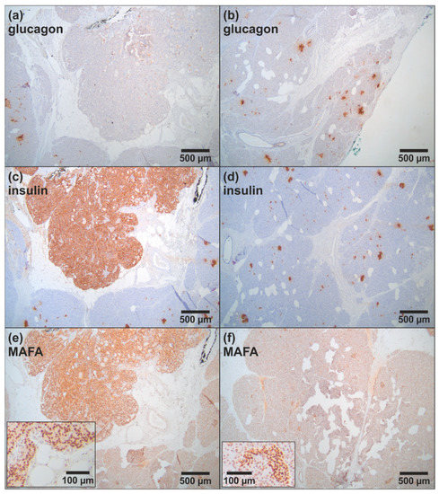 Serial sections from archival pancreatic tissue were subjected to MAFA immunohistochemistry as well as insulin and glucagon staining. The result was evaluated and compared to that of normal human pancreas by an experienced pathologist. To achieve comparability, MAFA immunohistochemistry was performed using the same MAFA antibody (Anti-MafA antibody ab26405, Abcam, Cambridge, UK, RRID: AB_776146; dilution: 1:2000) as Iacovazzo et al. [12] following the manufacturer’s instructions. After deparaffinization, hydration, and heat-induced epitope retrieval, incubation steps were carried out in an Autostainer 480-A (Thermo Fisher Scientific, Dublin, Ireland) using the Dako EnVision™ FLEX HRP/Dab (Agilent, Santa Clara, CA, USA) detection system with signal amplification by EnVision™ FLEX + Rabbit (LINKER) (Agilent, Santa Clara, CA, USA).