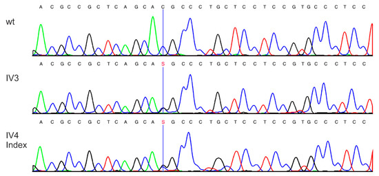 Figure 5. Confirmation of variant NM_201589.3 (MAFA): c.170C>G, p.Thr57Arg, in the two affected siblings by Sanger sequencing. wt: healthy control; IV3 corresponds to case 2 (Figure 1); IV4 Index to case 1.