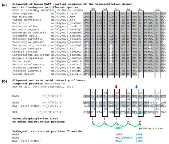 Figure 6. D/E/S/T/P-rich region of the MAFA transactivation domain (a) illustrates high conservation of a functionally essential part of the MAFA transactivation domain known to regulate MAFA binding to its target DNA sequences by phosphorylation. Conserved amino acid residues are shaded gray, and black frames indicate the phosphorylation sites. The numbering refers to human MAFA. (b) shows the high homology of this region among the members of the large MAF transcription factor family in humans and illustrates the GSK3-mediated phosphorylation cascade, which is initiated by the phosphorylation of residue 65 (MAFA) by a priming kinase (21, 23). Amino acid residues known to be affected by pathogenic variants are provided in blue and underlined, and the MAFA variant Ser64Phe is among them (blue arrow, S64F), which has been shown to cause a phosphorylation defect and a syndrome characterized by insulinomatosis, mild diabetes, and cataract (12). The red arrow marks the amino acid affected by the MAFA variant Thr57Arg (T57R) reported in this manuscript. In vitro transfection studies (23) have confirmed that the exchange of MAFA residues 65, 61, 57, 53, and/or 49 by alanine, an amino acid which cannot be phosphorylated, causes phosphorylation defects and impairs MAFA-binding to DNA. For two further large MAF proteins (MAFB and c-MAF), pathogenic missense variants have already been detected and among them include the MAFB variants Thr62Arg (21) and Thr62Ala (ClinVar VCV000807627.3, T62I/P/R/A) and the MAF (c-MAF) variant Thr62Arg (T62R) (24), variants with the same amino acid exchange as we now found in MAFA.