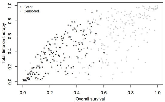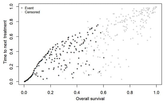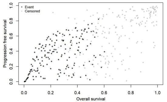 - Schemper, M.; Kaider, A.; Wakounig, S.; Heinze, G. Estimating the correlation of bivariate failure times under censoring. Stat. Med. 2013, 32, 4781–4790. [Google Scholar] [CrossRef] [PubMed]