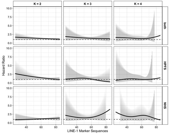 Heterogeneous Effect of Cumulative Categorical Alcohol Intake (>15 g/day vs. 0 g/day) on continuous subtypes of colorectal cancer; the 3 × 3 plot panel illustrates the combination of three choices of the knot number in and three cohort settings. Abbreviations: HPFS, Health Professionals Follow-up Study; LINE-1, long interspersed nucleotide element-1; NHS, Nurses’ Health Study.
