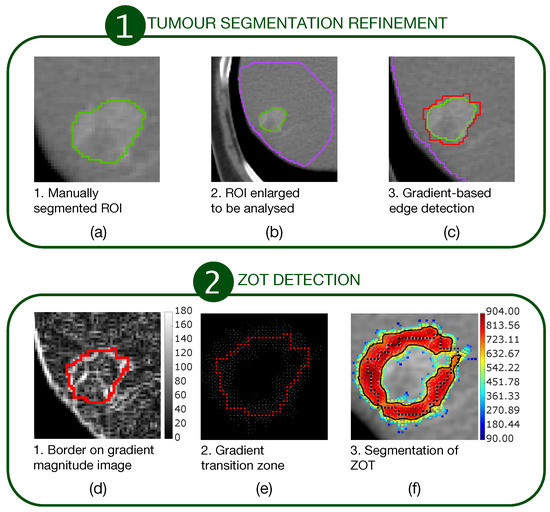 A two-stage procedure for ZOT detection. The first stage (a–c) refines the manually segmented ROIs. The second stage (d–f) detects ZOT, which is reconstructed starting from the tumour border, by exploring gradient variations for each pixel of the tumour border.