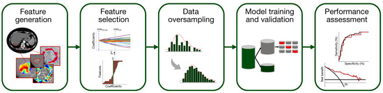 A classification model to predict the presence of MVI in HCC has been set up according to the flowchart of Figure 3 (the single steps are deepened in Section 2.5.1–Section 2.5.5).