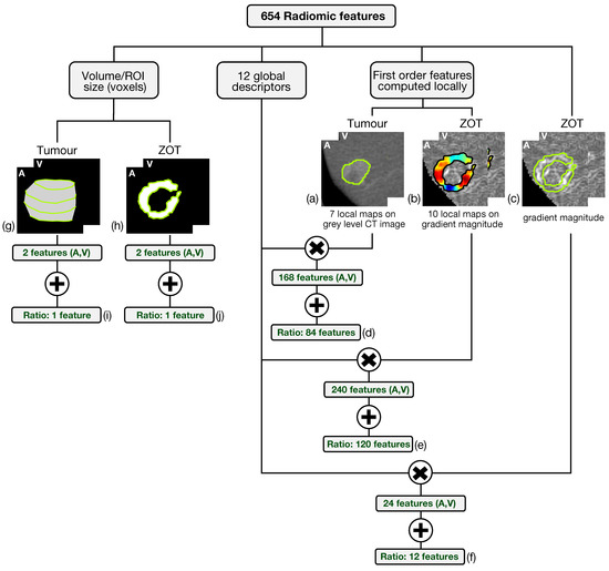 Subsequently, 12 global descriptors were also computed directly on gradient magnitude images of the arterial and venous phases within the ZOT (Figure 4c). Moreover, 216 radiomics features stem from the ratio between the features computed in the tumour (i.e., 84 features, Figure 4d) and the ZOT (i.e., 132 features, Figure 4e,f) ROIs, on the arterial and venous phases, respectively. Finally, 4 features refer to the volume measured in voxels of T and the ROI size of the ZOT, separately, in the arterial and the venous phases (i.e., 4 features, Figure 4g,h), together with the ratios of the two couple of features (i.e., referred to arterial and venous phases) for the ZOT and the tumour separately (i.e., 2 features, Figure 4i,j).
