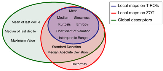 Venn diagram of the radiomics features computed as global descriptors (12, green area) or locally as parametric maps on T ROIs (7, blue area) and ZOT (ten, red area).