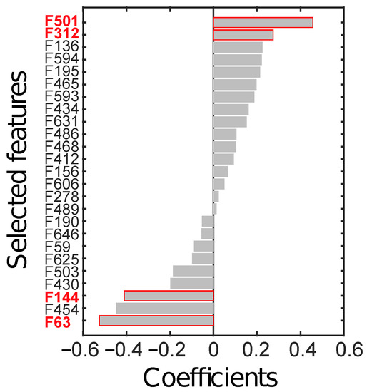 Radiomics features (F) selected through LASSO, sorted by their coefficients. The four features in red text colour (i.e., F63, F144, F312, and F501) are the ones finally selected to constitute the radiomics signature.
