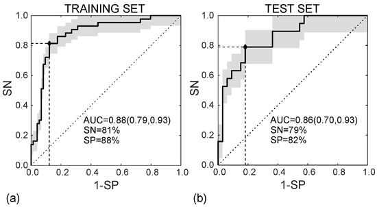 ROC curves referred to the training (a) and test (b) sets, achieving AUC = 0.88 95%CI (0.79, 0.93) and AUC = 0.86 95%CI (0.70, 0.93), respectively.