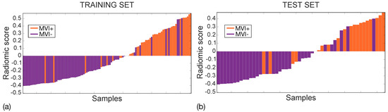 Waterfall plots for training (a) and test (b) sets. MVI+ and MVI− samples are represented through orange and purple bars, respectively with zero representing the cut-off.