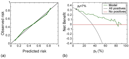 Figure 10a shows the calibration curve of the radiomic signature in the test set, with good agreement between predicted and observed risk probabilities. The Hosmer–Lemeshow test yielded p = 0.556, which indicates no departure from the perfect fit. In addition, the DCA shown in Figure 10b indicated that the radiomic model was better than both “all positive” and “all negative” strategies if the threshold probability was over 7%, which corresponded to a maximum net benefit of 32%.